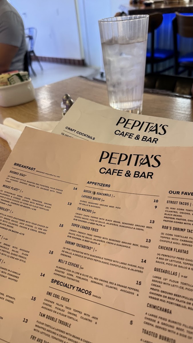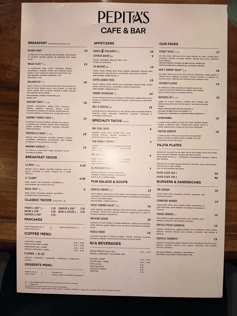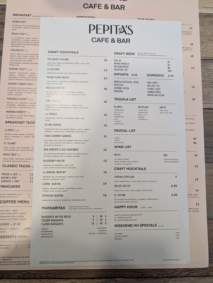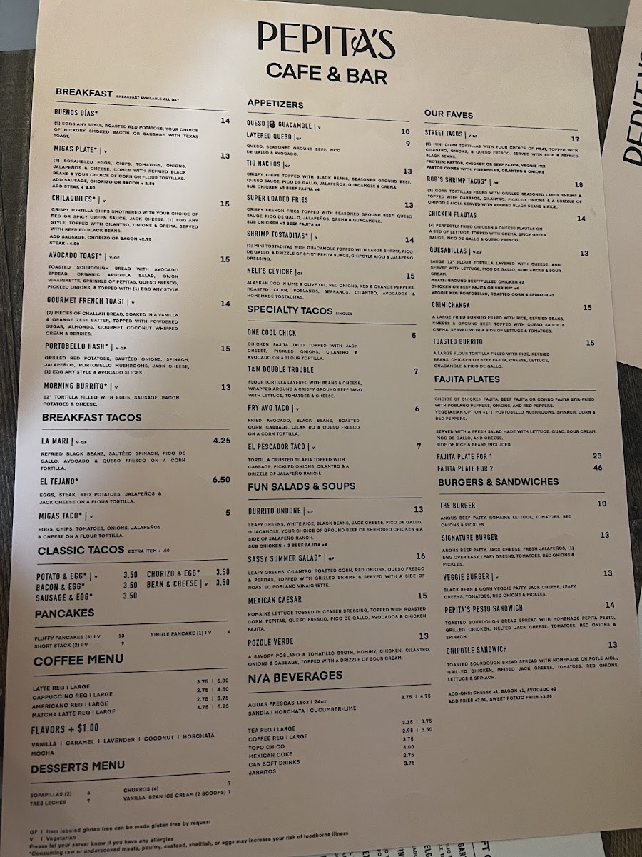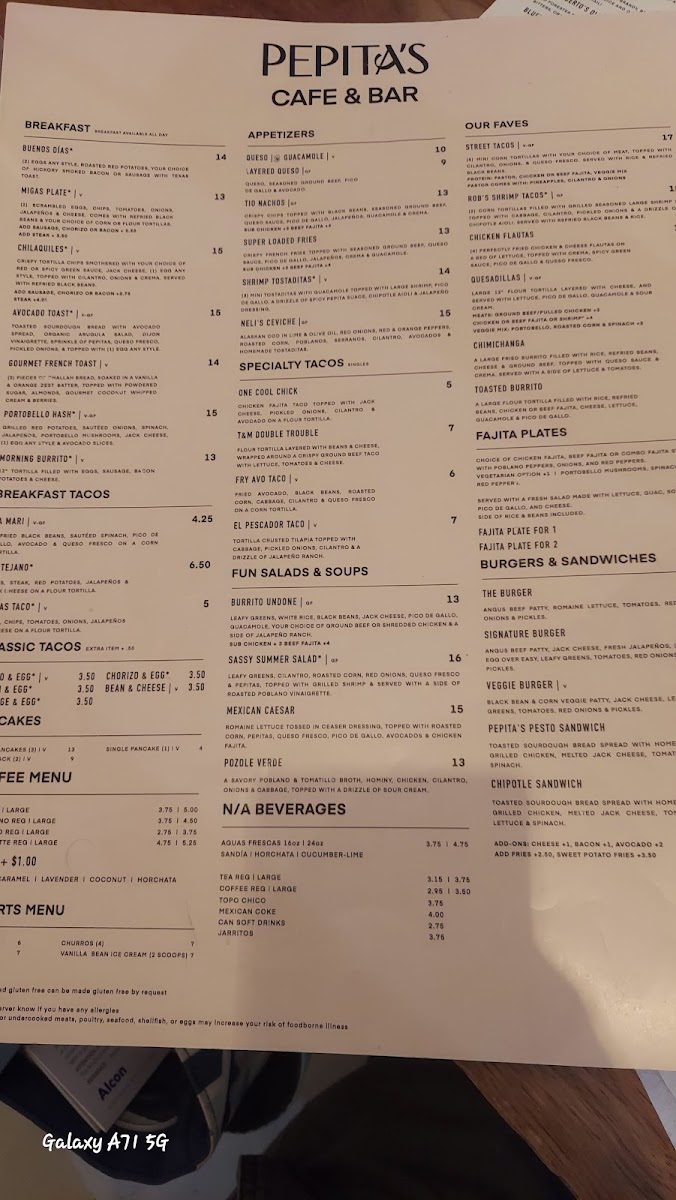 From a reviewer’s perspective, the menu at Pepita’s Cafe & Bar offers a lively and well-rounded selection that blends classic Tex-Mex comfort with creative flair, even if prices aren’t listed. Breakfast favorites like Buenos Dias Plate, Migas Plate, Chilaquiles, and Avocado Toast set a strong tone for the day, complemented by customizable breakfast tacos such as La Mari, Tejano, and Migas Taco. The variety continues with approachable kid-friendly options like Kid. Chicken Tenders and Leo’s Corn Dog, while appetizers like Queso, Guacamole, and Layer Queso make for easy crowd-pleasers. Standout mains include specialty tacos such as Cool Chick Taco and El Pescador Taco, as well as hearty staples like STREET TACOS, ROB’S SHRIMP TACOS, CHIMICHANGA, and QUESADILLAS. The menu also caters to broader tastes with items like THE BURGER, VEGGIE BURGER, and PESTO SANDWICH. Drinks are equally diverse, ranging from craft cocktails like Tio Edgar’s Paloma and Pepino Ranch Water to margaritas such as Frozen Rita and Tito Rita, alongside beers like Dos XX 16oz and Love Street 16oz. Non-alcoholic options, mocktails like (Virgin) Mojito Solito, and brunch staples like HH Mimosa round out the experience. Overall, the menu feels generous, vibrant, and designed to satisfy a wide range of cravings in a casual yet energetic setting.