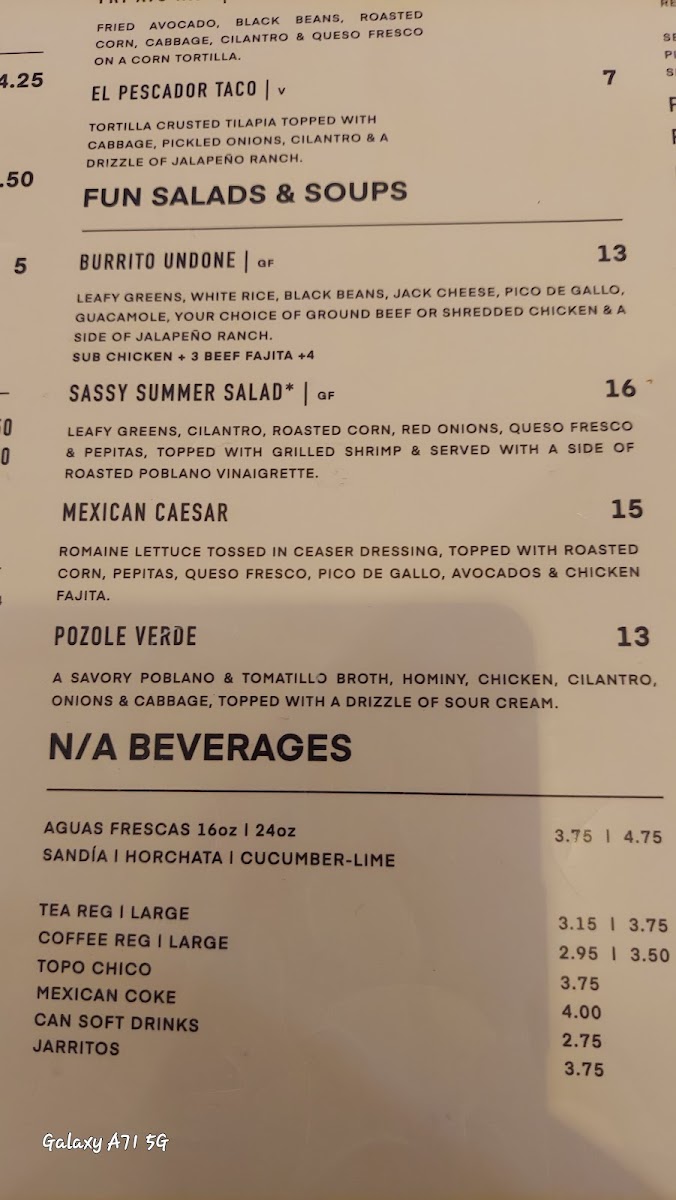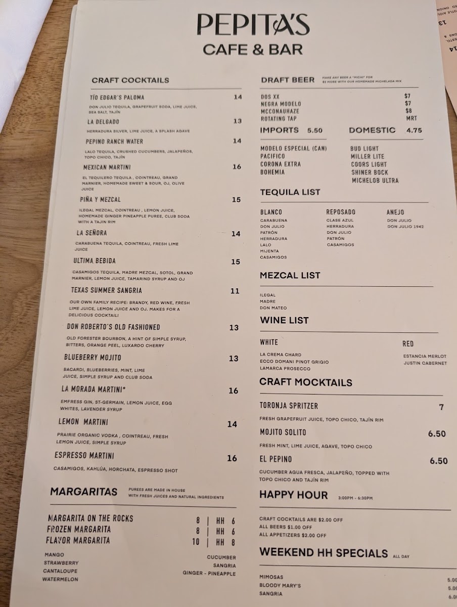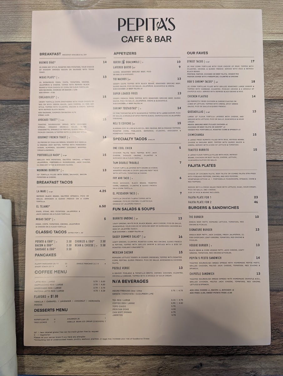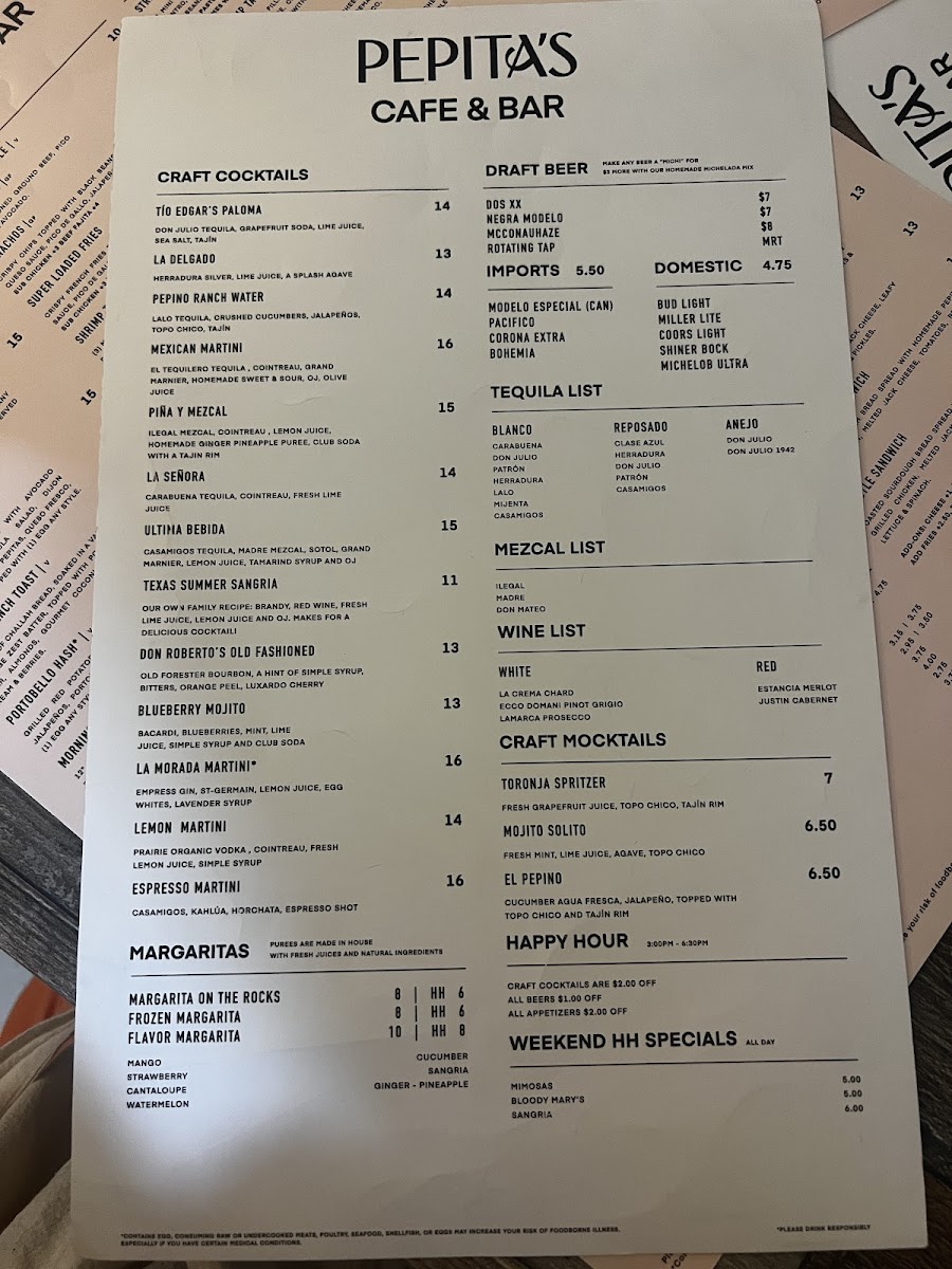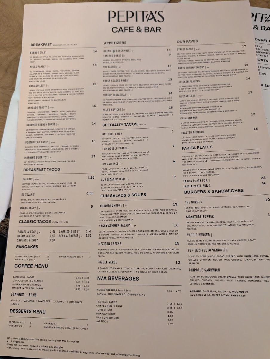 From a reviewer’s perspective, the menu at Pepita’s Cafe & Bar offers a lively and well-rounded selection that blends classic Tex-Mex comfort with creative flair, even if prices aren’t listed. Breakfast favorites like Buenos Dias Plate, Migas Plate, Chilaquiles, and Avocado Toast set a strong tone for the day, complemented by customizable breakfast tacos such as La Mari, Tejano, and Migas Taco. The variety continues with approachable kid-friendly options like Kid. Chicken Tenders and Leo’s Corn Dog, while appetizers like Queso, Guacamole, and Layer Queso make for easy crowd-pleasers. Standout mains include specialty tacos such as Cool Chick Taco and El Pescador Taco, as well as hearty staples like STREET TACOS, ROB’S SHRIMP TACOS, CHIMICHANGA, and QUESADILLAS. The menu also caters to broader tastes with items like THE BURGER, VEGGIE BURGER, and PESTO SANDWICH. Drinks are equally diverse, ranging from craft cocktails like Tio Edgar’s Paloma and Pepino Ranch Water to margaritas such as Frozen Rita and Tito Rita, alongside beers like Dos XX 16oz and Love Street 16oz. Non-alcoholic options, mocktails like (Virgin) Mojito Solito, and brunch staples like HH Mimosa round out the experience. Overall, the menu feels generous, vibrant, and designed to satisfy a wide range of cravings in a casual yet energetic setting.